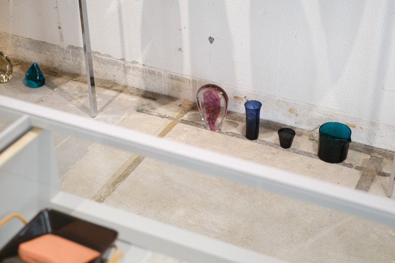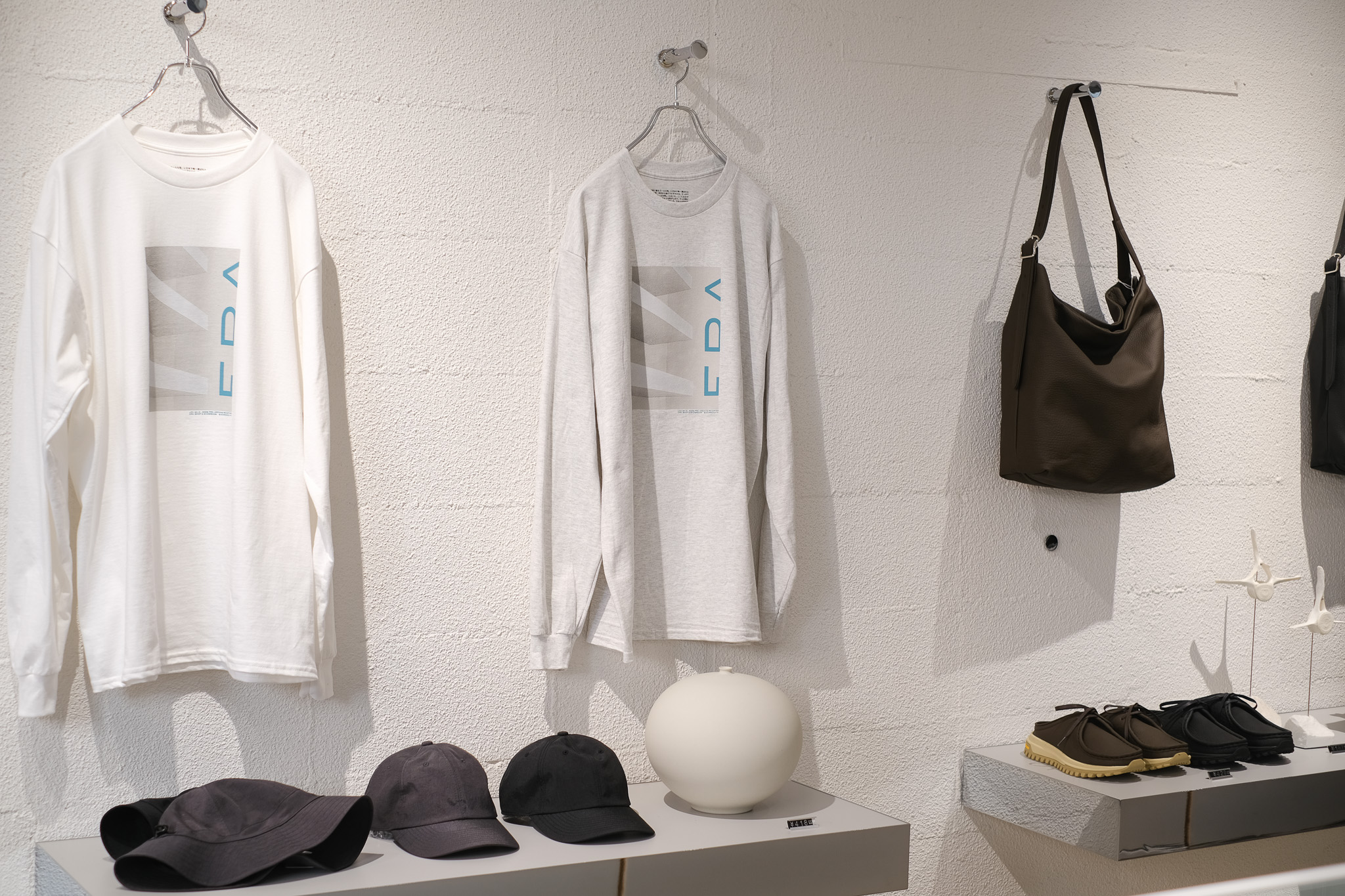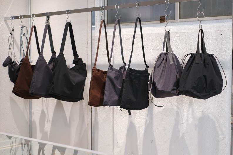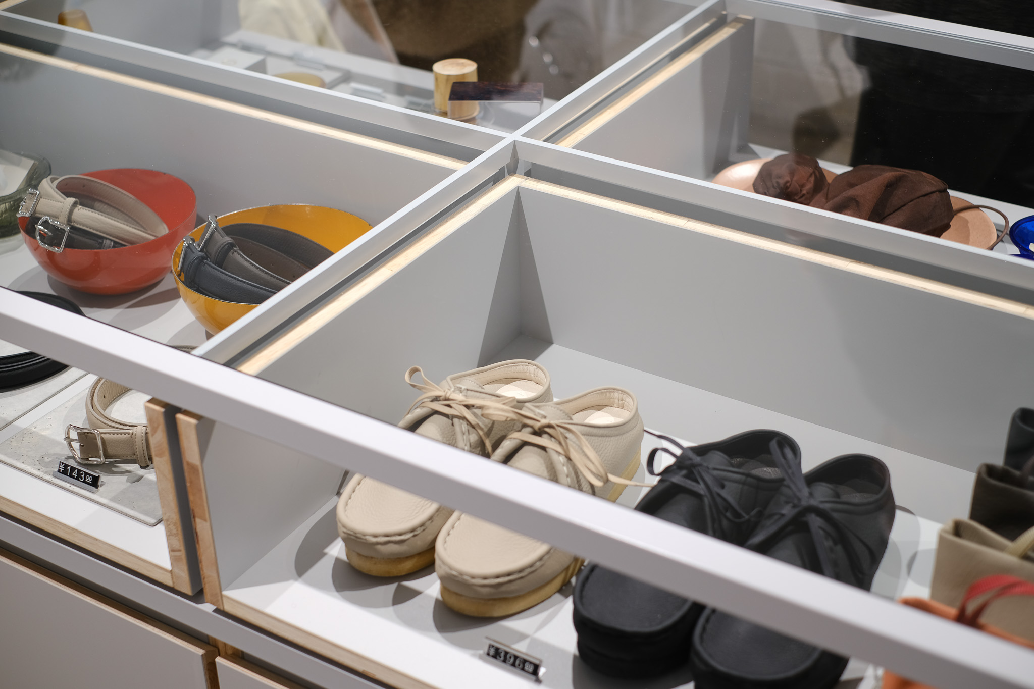 バッグやレザーグッズがシンプルな空間に並びます。